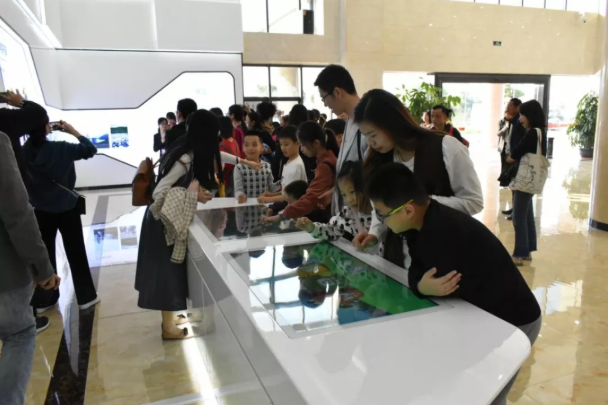学生家长在一楼环保展厅体验环保互动游戏