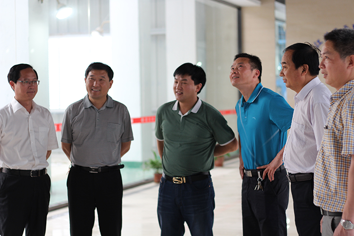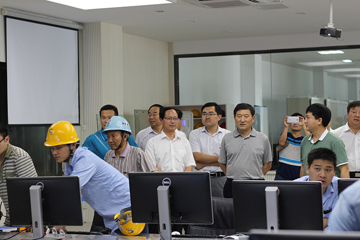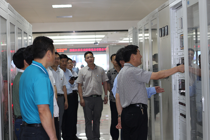 盱眙县副县长章文风(右四),古桑乡党委书记孙霖(右五),盱眙县政府办主任张士柱(右六)莅临中控室现场参观并网发电情况