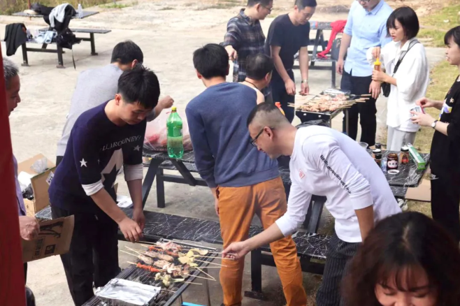 返回山脚的草地上,大家撸起袖子参与到自助烧烤的准备工作中来。生火、洗菜、切肉、串肉......大家分工明确,各司其职,就像搭档多年的团队,默契十足。一串串食材在炭火的炙烤中变成了美味佳肴,大家边享受自己烤制的美食,边聊着工作、生活中的趣事,欢声笑语随着袅袅炊烟萦绕在空中。