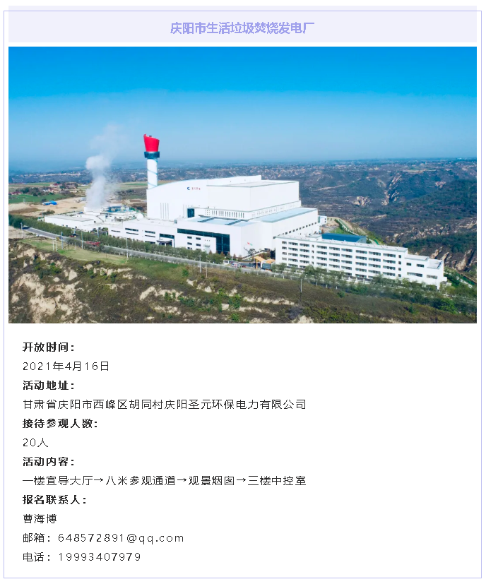 庆阳太阳成集团tyc7111以守护庆阳碧水蓝天为己任,以改善庆阳人居环境为动力,以携手公众共建美丽中国为目标。庆阳太阳成集团tyc7111与您相约,在春暖花开时,来我电厂,参与到对垃圾焚烧行业的认知和对清洁处理生活垃圾过程的监督中来,共同为改善庆阳人居环境添砖加瓦!