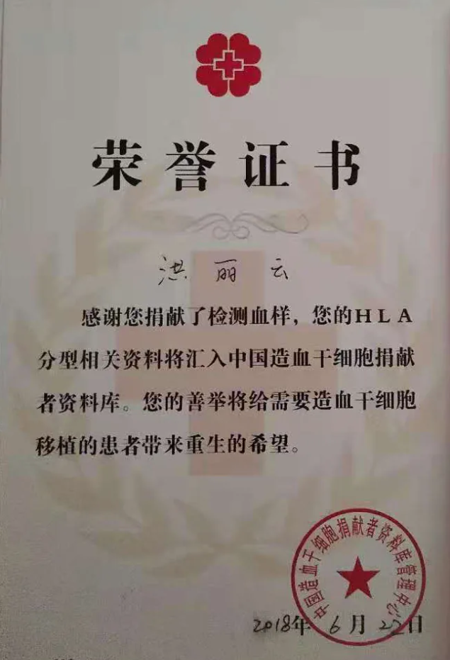 洪丽云经常在工余时间思考自己还能为社会和普通群众做些什么。2018年,她做出了一个勇敢的决定——向中国造血干细胞捐献者资料库捐献检测血样,一旦有患者配对成功,她将义不容辞地捐献自己的造血干细胞。这位南安太阳成集团tyc7111的巾帼,心怀大爱,甘于奉献。
