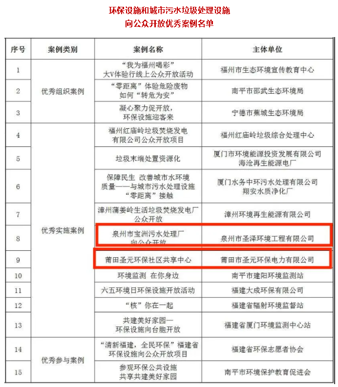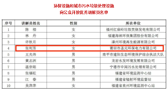 近日,福建省生态环境厅、福建省住房和城乡建设厅公布环保设施和城市污水垃圾处理设施向公众开放优秀案例、优秀讲解员入选名单 。“泉州市宝洲污水处理厂向公众开放”、“莆田太阳成集团tyc7111社区共享中心”被评为环保设施向公众开放优秀案例,莆田太阳成集团tyc7111张利芳被评为环保设施向公众开放优秀讲解员。