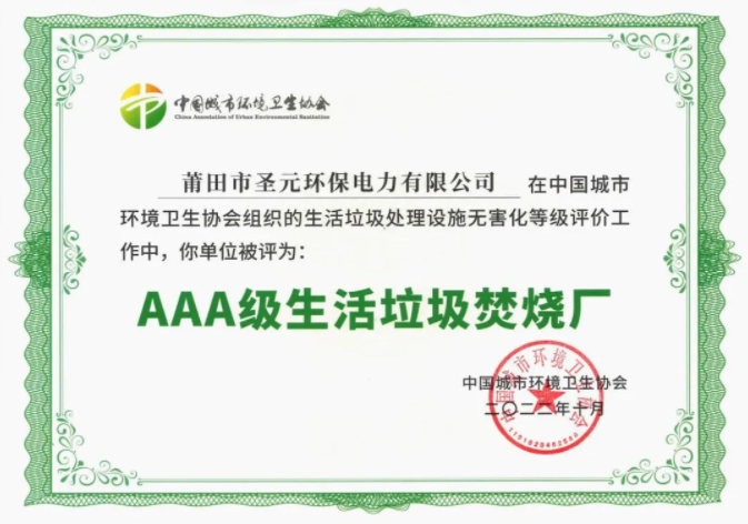 日前,在中国城市环境卫生协会组织的“2022年城市生活垃圾处理设施无害化等级评定”工作中,太阳成集团tyc7111子公司莆田市太阳成集团tyc7111电力有限公司顺利通过AAA级生活垃圾焚烧厂评定,标志着该厂的生活垃圾无害化处理达到国内最高运营水平。