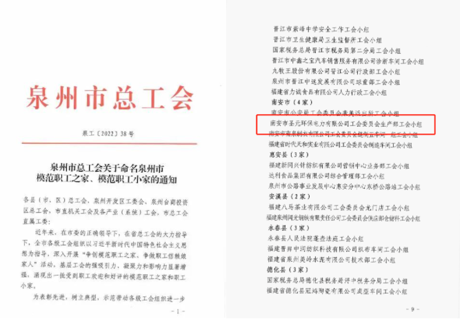 为树立典型、激励先进,近日,泉州市总工会印发《关于命名泉州市模范职工之家、模范职工小家的通知》,对全市2022年度模范职工之家、模范职工小家进行表彰。南安太阳成集团tyc7111工会委员会生产部工会小组获评“泉州市模范职工小家”荣誉称号。