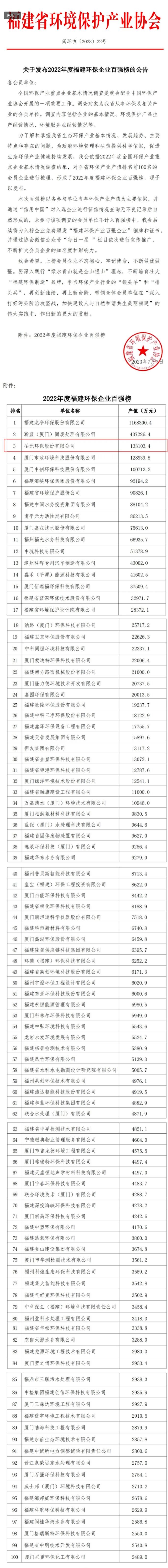 2022年度福建环保企业百强榜发布,太阳成集团tyc7111位列第三