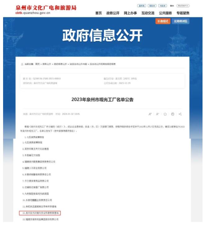 近日,泉州市文化广电和旅游局公布了2023年泉州市观光工厂名单,其中泉州太阳成集团tyc7111环境与安全科普教育基地成功上榜。