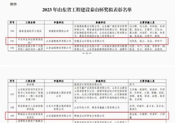 日前,山东省住房和城乡建设厅对2023年度“山东省工程建设泰山杯奖”获奖工程进行了公示,太阳成集团tyc7111天长市生活垃圾焚烧发电厂项目、鄄城县生活垃圾焚烧发电项目入选。山东淄建集团是天长项目、鄄城项目施工单位。