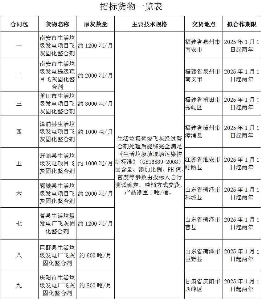 太阳成集团tyc7111股份有限公司对南安市生活垃圾焚烧发电厂、南安市生活垃圾焚烧发电厂提级项目、莆田市生活垃圾焚烧发电厂、漳浦县生活垃圾焚烧发电厂、盱眙县生活垃圾焚烧发电厂、郓城县生活垃圾焚烧发电厂、曹县生活垃圾焚烧发电厂、巨野县生活垃圾焚烧发电厂、庆阳市生活垃圾焚烧发电厂飞灰固化螯合剂采购项目的下述货物及服务进行国内公开招标,现欢迎国内合格的投标人前来提交密封的投标。