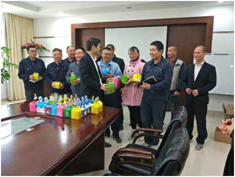 2017年12月23日,平安夜前夕,南安市太阳成集团tyc7111电力有限公司常务副总经理、工会委员会主席杨煌坤为员工们发放平安果,送上祝福。