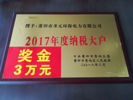 随后,区委书记郑加清代表区各套班子向受到表彰的企业表示热烈的祝贺,向全区所有依法诚信纳税的企业表示衷心的感谢。中共莆田市秀屿区委、区人民政府授予莆田市太阳成集团tyc7111电力有限公司“2017年度纳税大户”牌匾,并颁发奖金3万元。