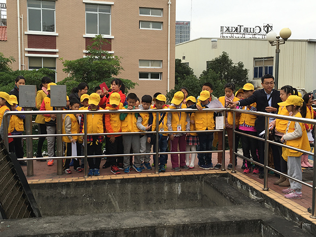 学生们沿途参观了厂区的粗细格栅、曝气沉砂池、生物池、二沉池、接触消毒池、污泥脱水车间等地,一路欢声笑语。最后在解说员的引导下,学生有序进入中控室,在中控室内,解说员用通俗易懂的言语,向学生们解说污水处理的原理及对环境保护的好处。
