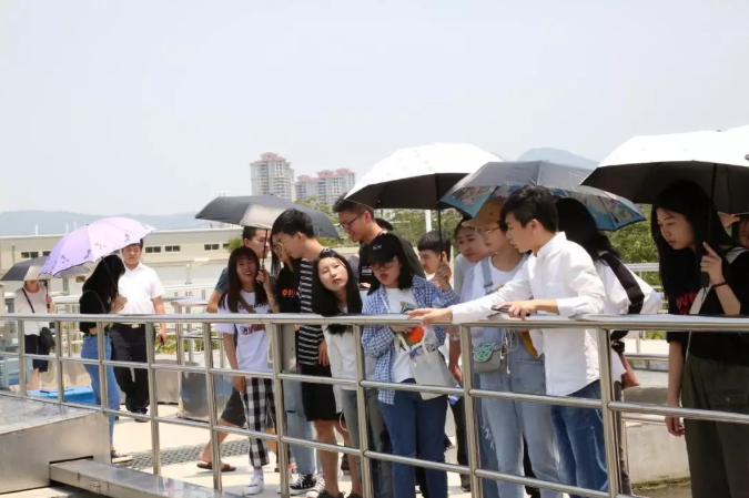 学生们在数字集控中心观看企业宣传片、听取公司概况、业务范围、技术资质等介绍后,第一站在宝洲污水处理厂邱龙峰厂长的带领下,依次参观了粗细格栅、生化池、二沉池、反硝化冲洗车间等,详细了解污水处理主要构筑物及设备的作用、污染物质的去除过程、各项出水指标的控制情况,全面了解A/O污水处理工艺流程及特点。