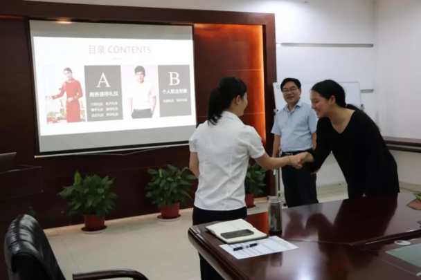 此次培训,由人事行政部经理蔡艳滨授课。培训采用图文并茂、穿插案例的方式,针对日常工作中接待礼仪、会议礼仪、拜访礼仪及职业形象等重点环节进行生动详尽的讲解,使员工初步掌握在各种商务活动中提升修养和魅力的技巧。